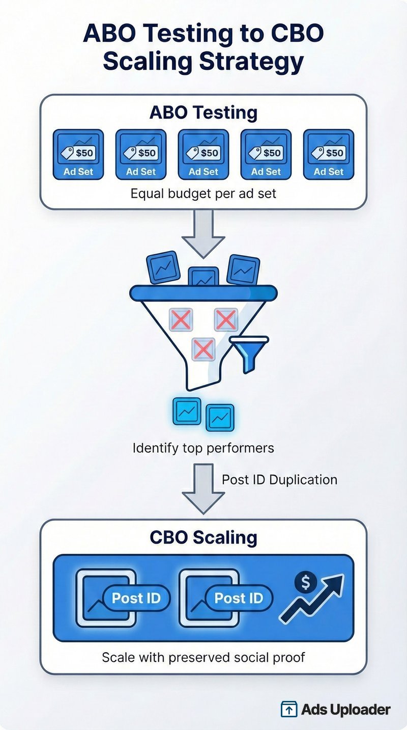- Top advertisers use both. ABO for controlled testing, CBO for efficient scaling. Post ID duplication bridges the two by preserving social proof when moving winners.