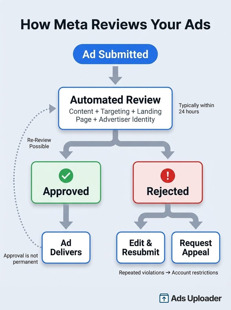 - Approval is not permanent. Meta's documentation states that "ads remain subject to review and re-review at all times, and may be rejected or restricted for violating our policies at any time."