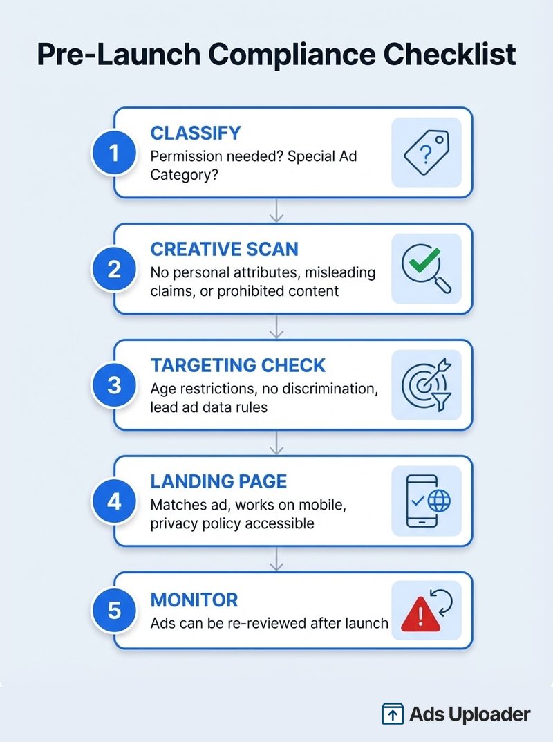 Use this as a pre-flight check before every ad submission. The five-step framework is: classify your category, scan your creative, check your targeting, verify your destination, then monitor after launch.