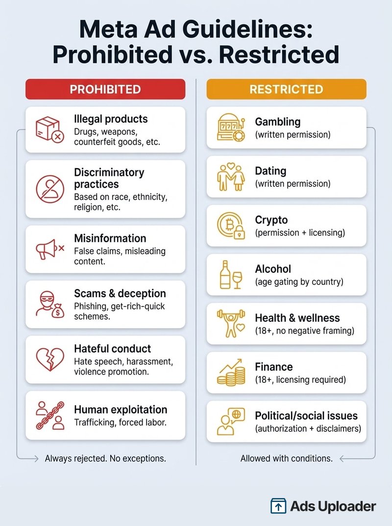 - Know the difference between prohibited and restricted. Prohibited content is a hard stop. Restricted content is allowed with conditions. Most rejections happen in the restricted zone because advertisers miss the conditions.