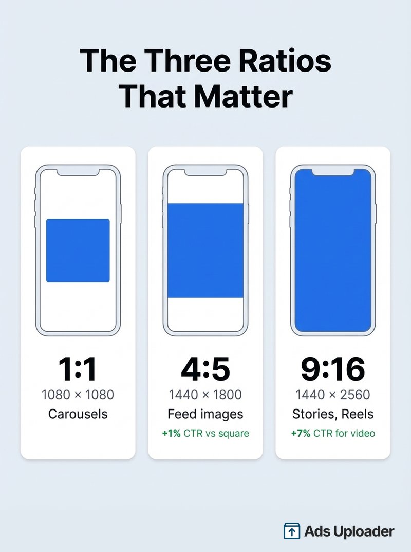 The math is straightforward. A 4:5 Feed asset is 25% taller than a 1:1 square at the same width - extra screen real estate before any caption or UI chrome. Meta's own research backs this up: 4:5 images deliver approximately 1% higher CTR than 1:1, and 9:16 video generates a 7% higher CTR. Those numbers sound modest until you compound them across five- and six-figure monthly budgets.