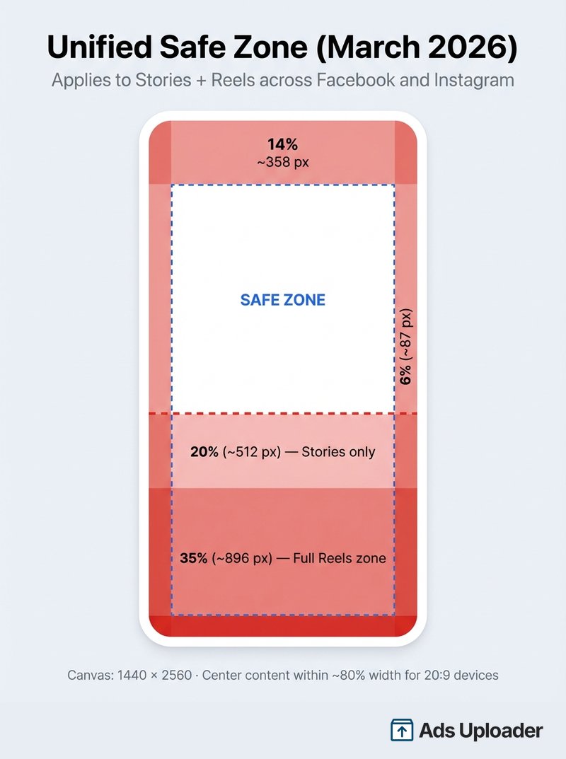As of March 2026, Stories and Reels share a unified safe zone. On a 1440x2560 canvas: top 14% (~358px), bottom 20-35% (~512-896px), sides 6% (~87px). If designing for Stories only, the bottom shrinks to 14% (~358px). Toggle the Safe Zone Guardrail in Ads Manager to verify.