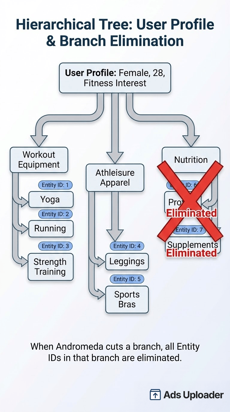 If Meta Andromeda determines this user is currently in a "yoga" intent state based on recent behavior, it might cut the entire "Nutrition" branch from consideration. All your Entity IDs in that branch (11, 12, 13) don't even make it to the auction, no matter how well-optimized they are.