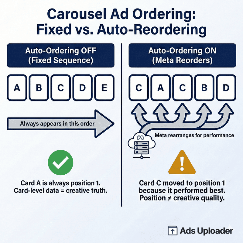 In Ads Manager, use Breakdown → By action → Carousel card to view card-level results. Always note whether auto-ordering is enabled. If Meta is reordering your cards based on performance, "Card 1" in the data may not be the card you designed for position one.
