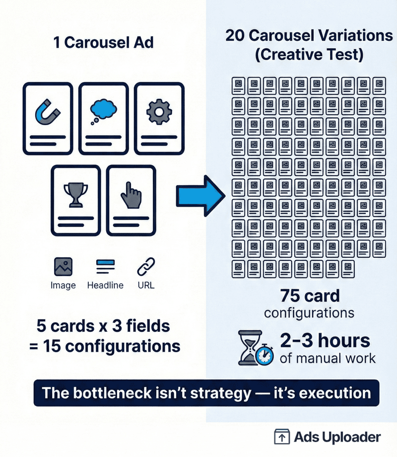 The bottleneck isn't strategy. It's execution. Every card needs its own image upload, headline, URL and CTA configuration. Multiply that by five cards per carousel and 20 variations per test, and you're looking at 100 individual card configurations.