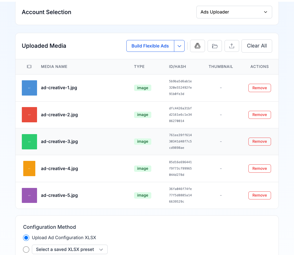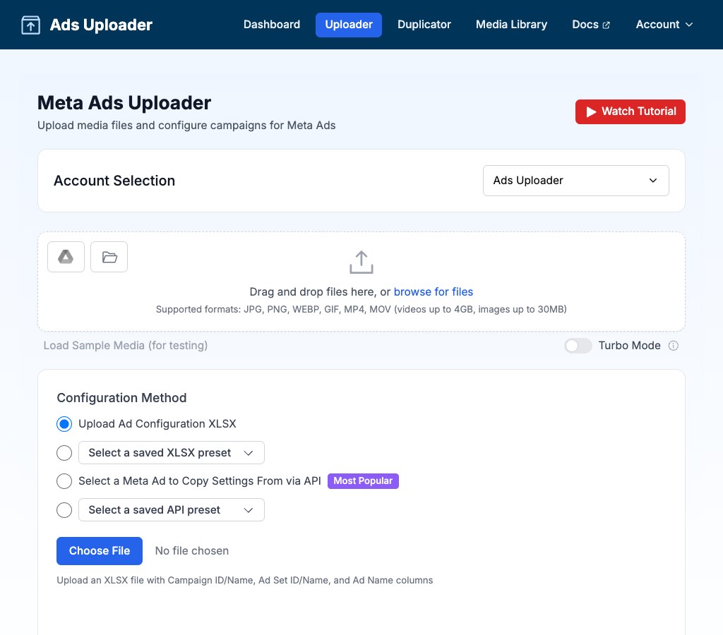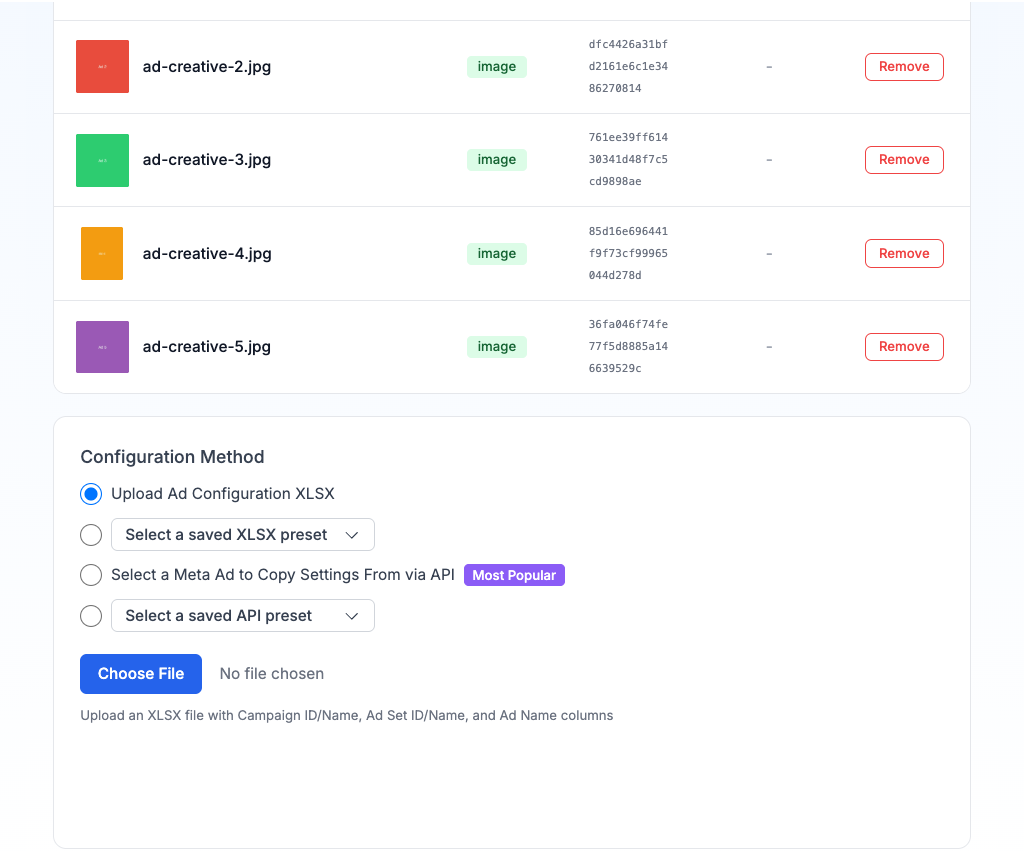 | Upload Ad Configuration XLSX | Upload an exported XLSX from Meta Ads Manager |